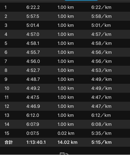 水曜日。 今日のラン。朝ラン:ペース走。 14.02km - 1:13:40 - 5:15/km - 175spm - 1.08m アップ2km、ダウンも2km。 キロ5で。後半早いのは若干下りだから。 ロング走が2回続けていまいちで、ちょっともやもやしてる。ダウンジョグに入ってから走り切れない…